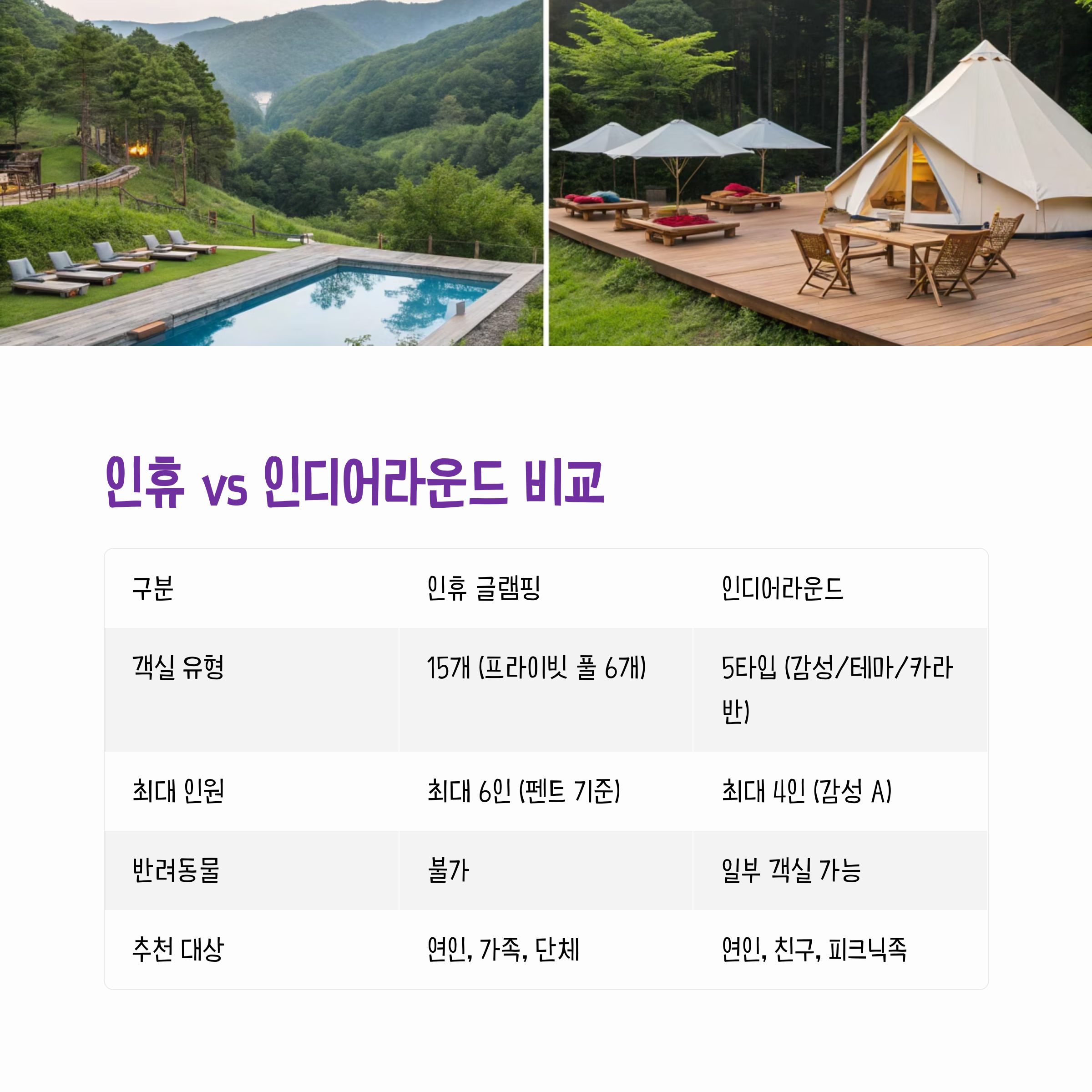 | 객실 수/유형 | 15개 (프라이빗 풀 6개) | 감성/테마/카라반 등 5타입 |
