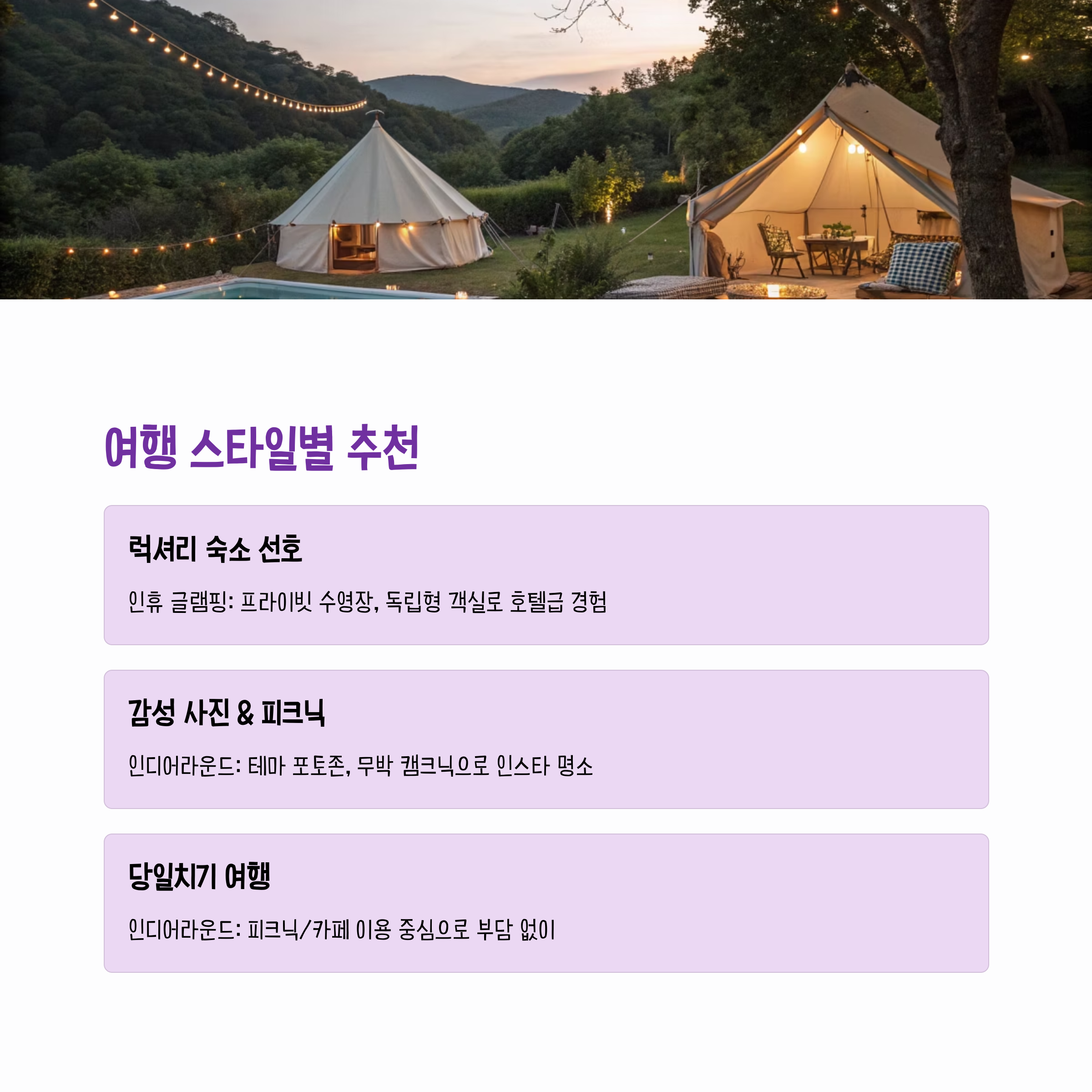 이천 글램핑은 각각의 스타일에 맞춰 선택만 잘 해도, 도심 탈출 하루가 특별한 힐링으로 변합니다.