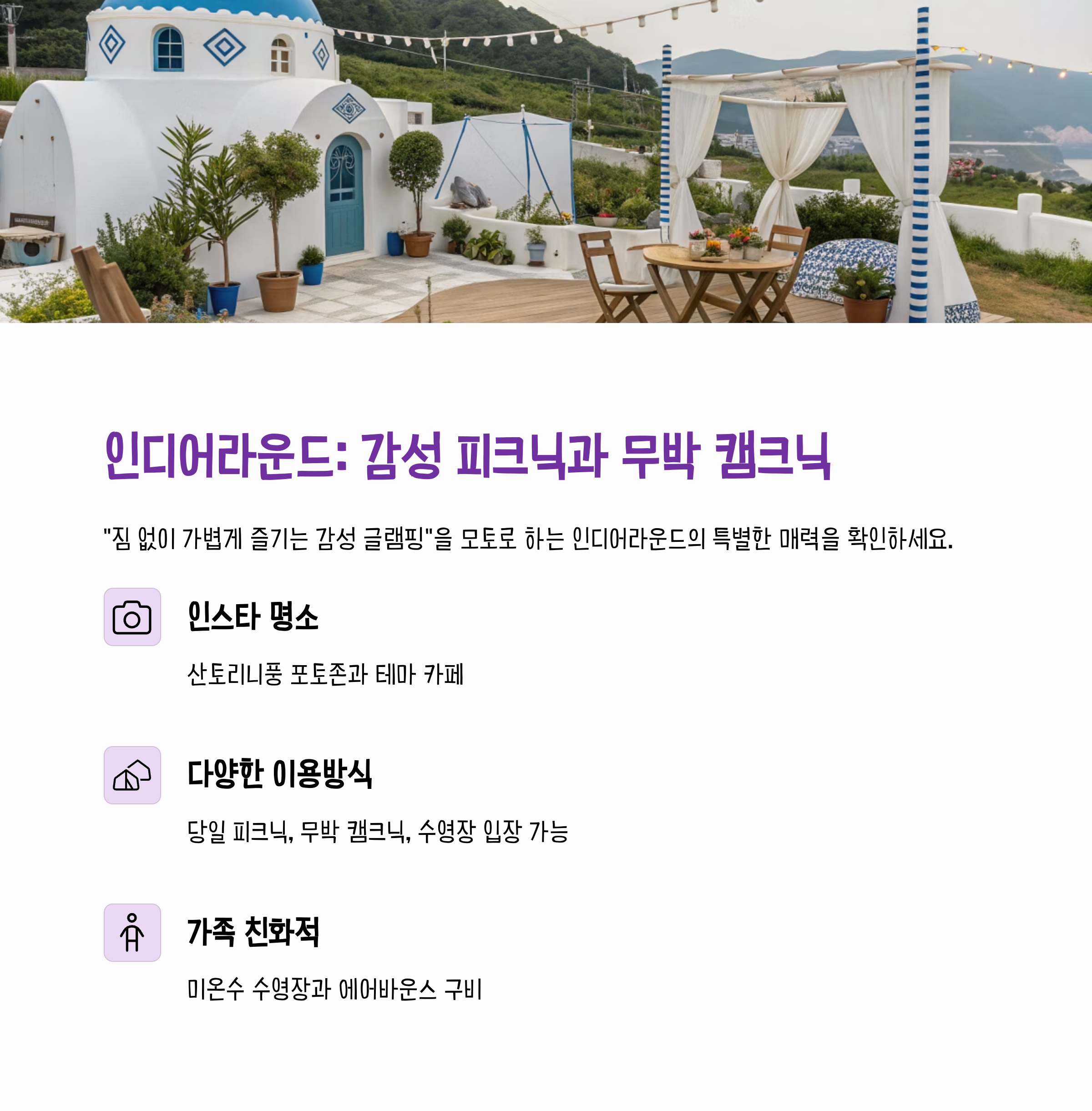 인디어라운드는 "짐 없이 가볍게 즐기는 감성 글램핑"을 모토로 하고 있습니다.