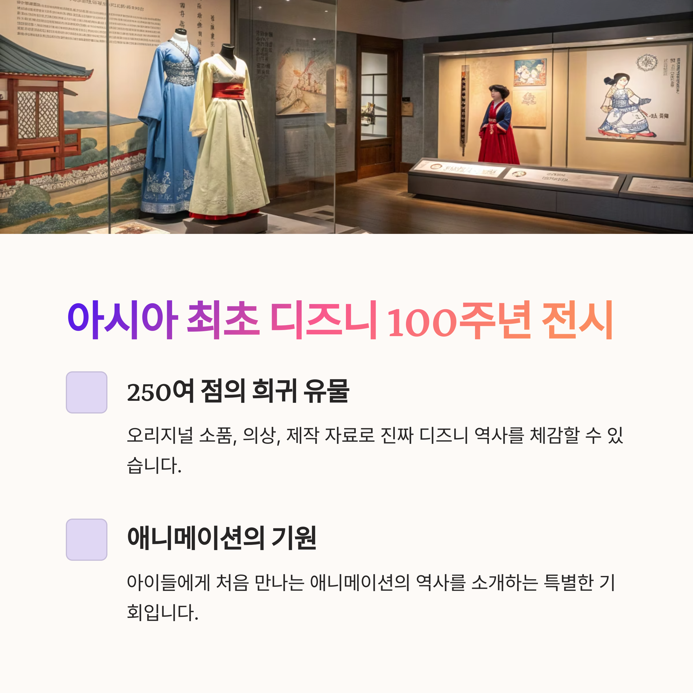 이 전시는 단순한 기념 행사를 넘어, 디즈니 역사 100년을 한눈에 담아낸 몰입형 전시로