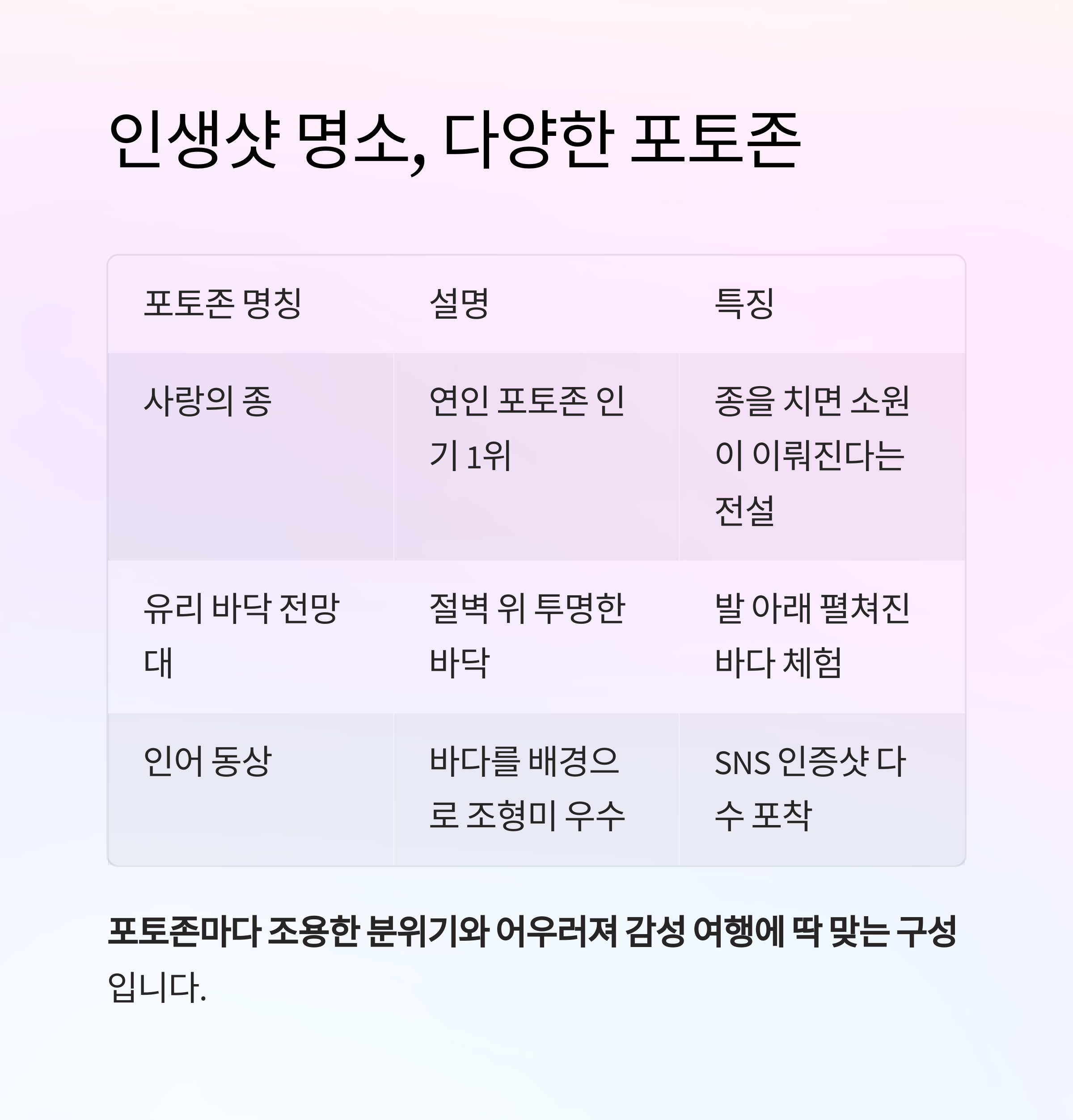 포토존마다 조용한 분위기와 어우러져 감성 여행에 딱 맞는 구성입니다.