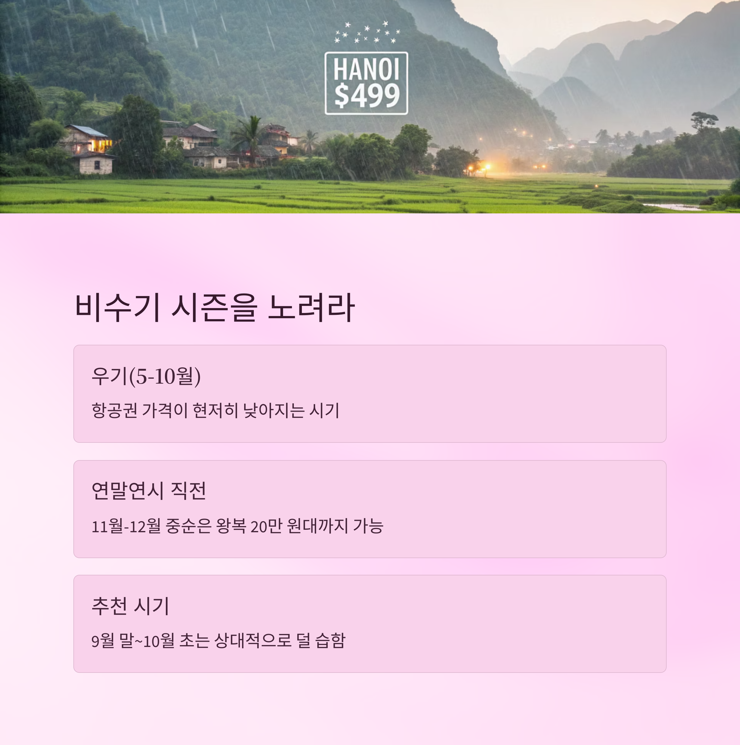 베트남의 비수기인 우기 (5-10월)항공권 가격이 현저히 낮아지는 시기입니다.