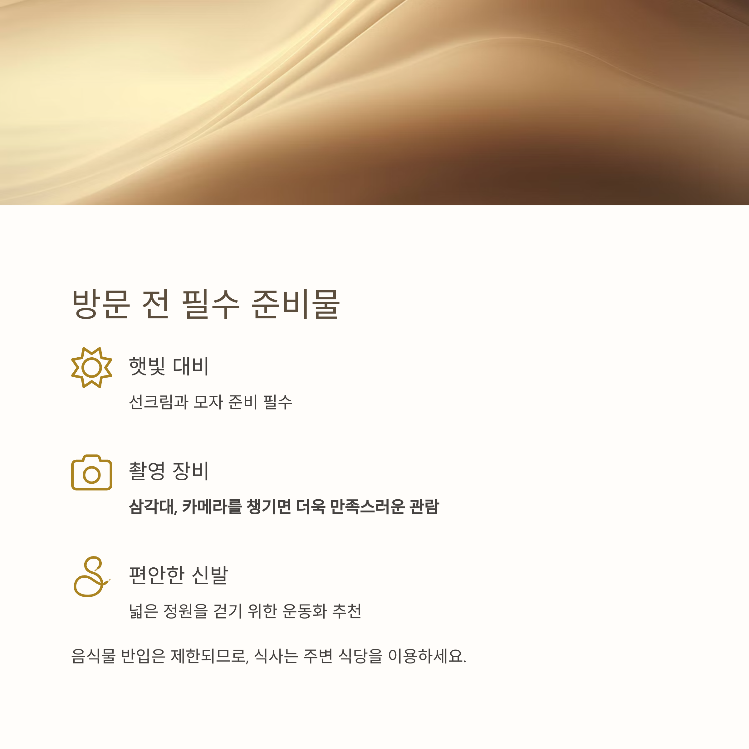 편안한 운동화와 삼각대, 카메라를 챙기면 더욱 만족스러운 관람이 됩니다.