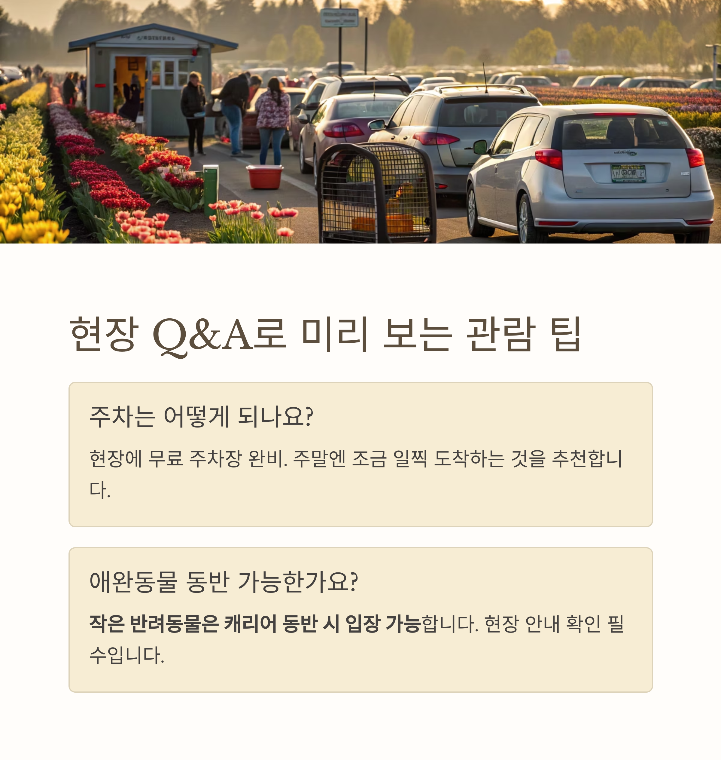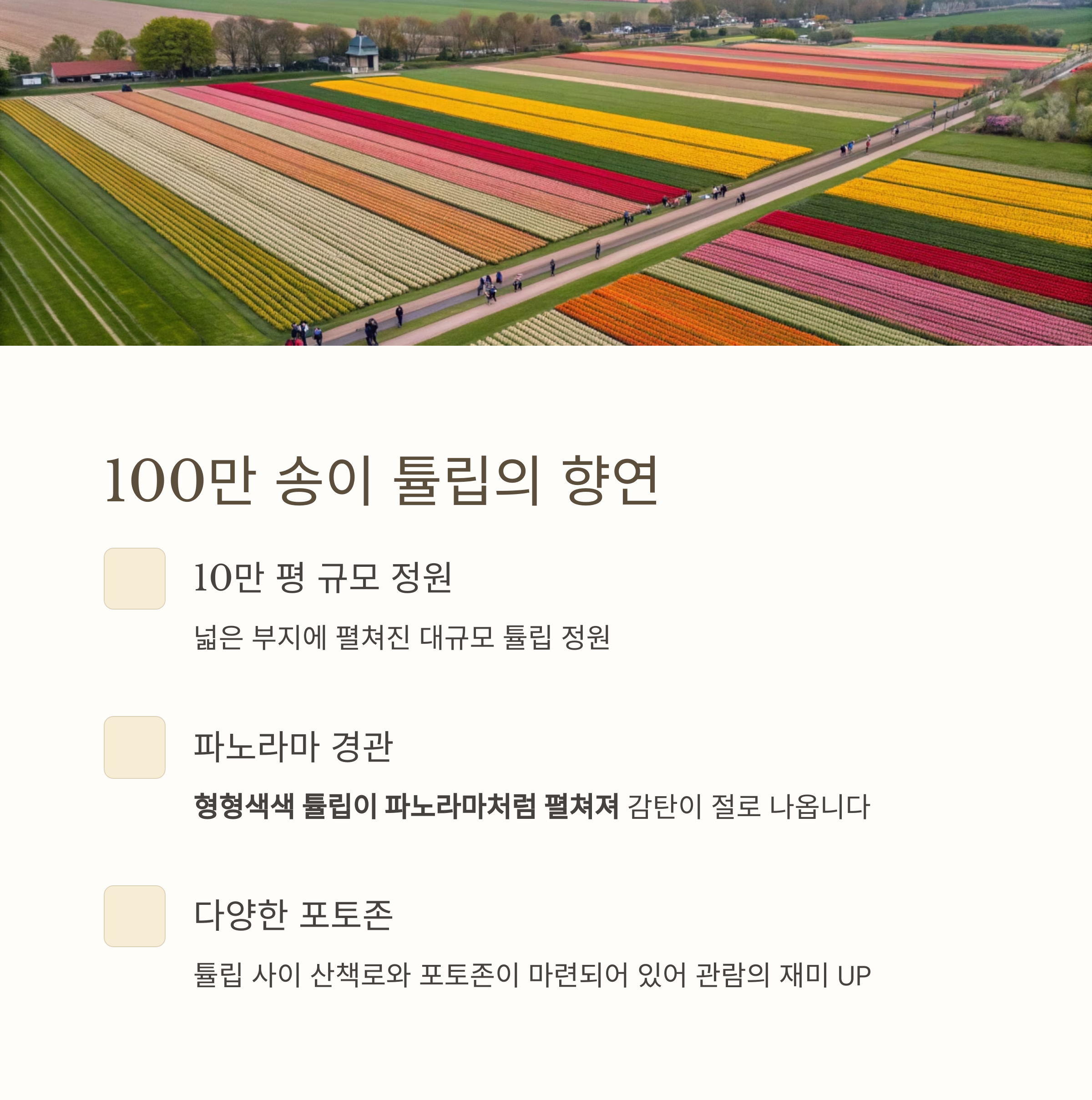 형형색색 튤립이 파노라마처럼 펼쳐져 있어, 발길 닿는 곳마다 감탄이 절로 나옵니다.