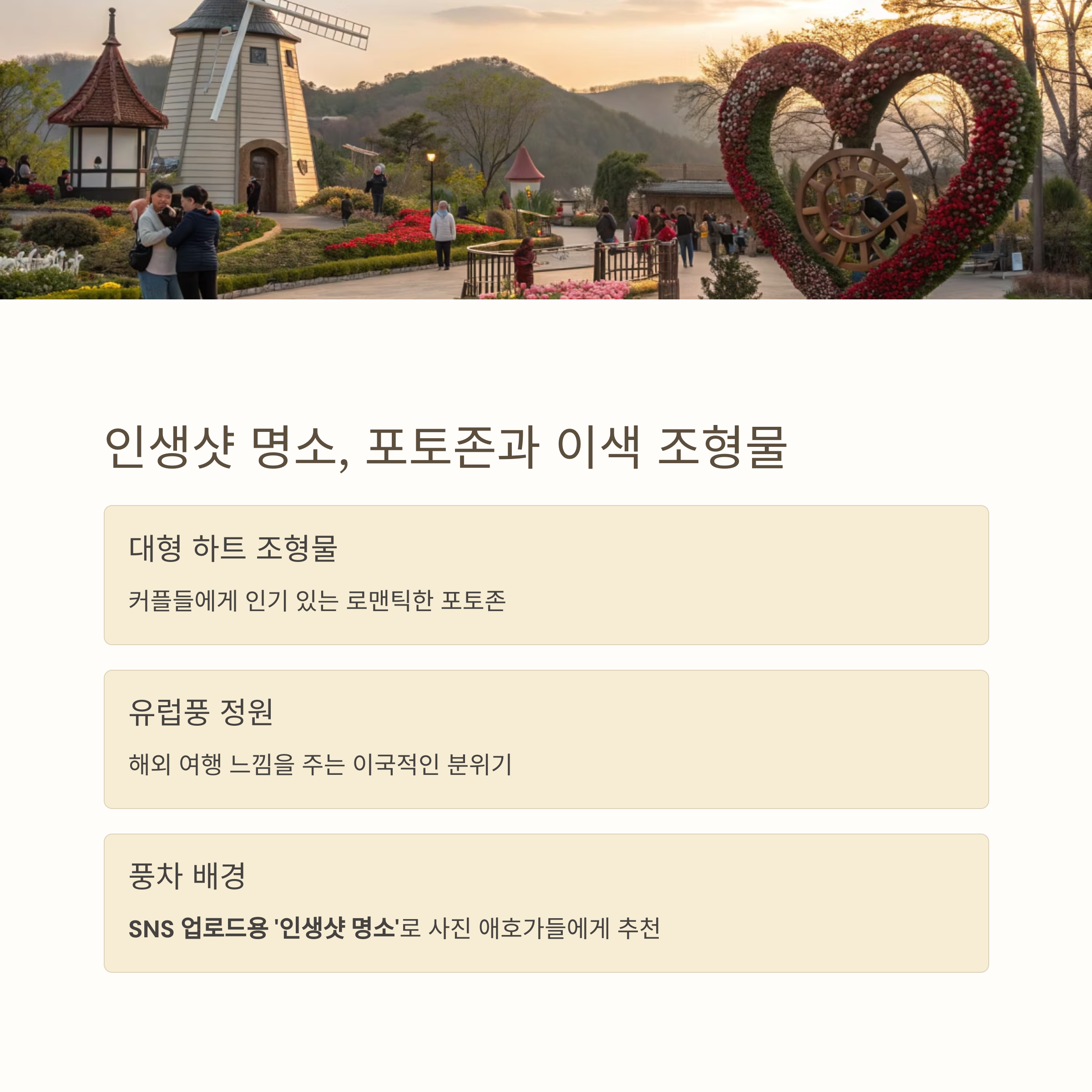 튤립뿐 아니라 대형 하트 조형물, 유럽풍 정원, 풍차 배경 포토존도 큰 인기를 끌고 있습니다.