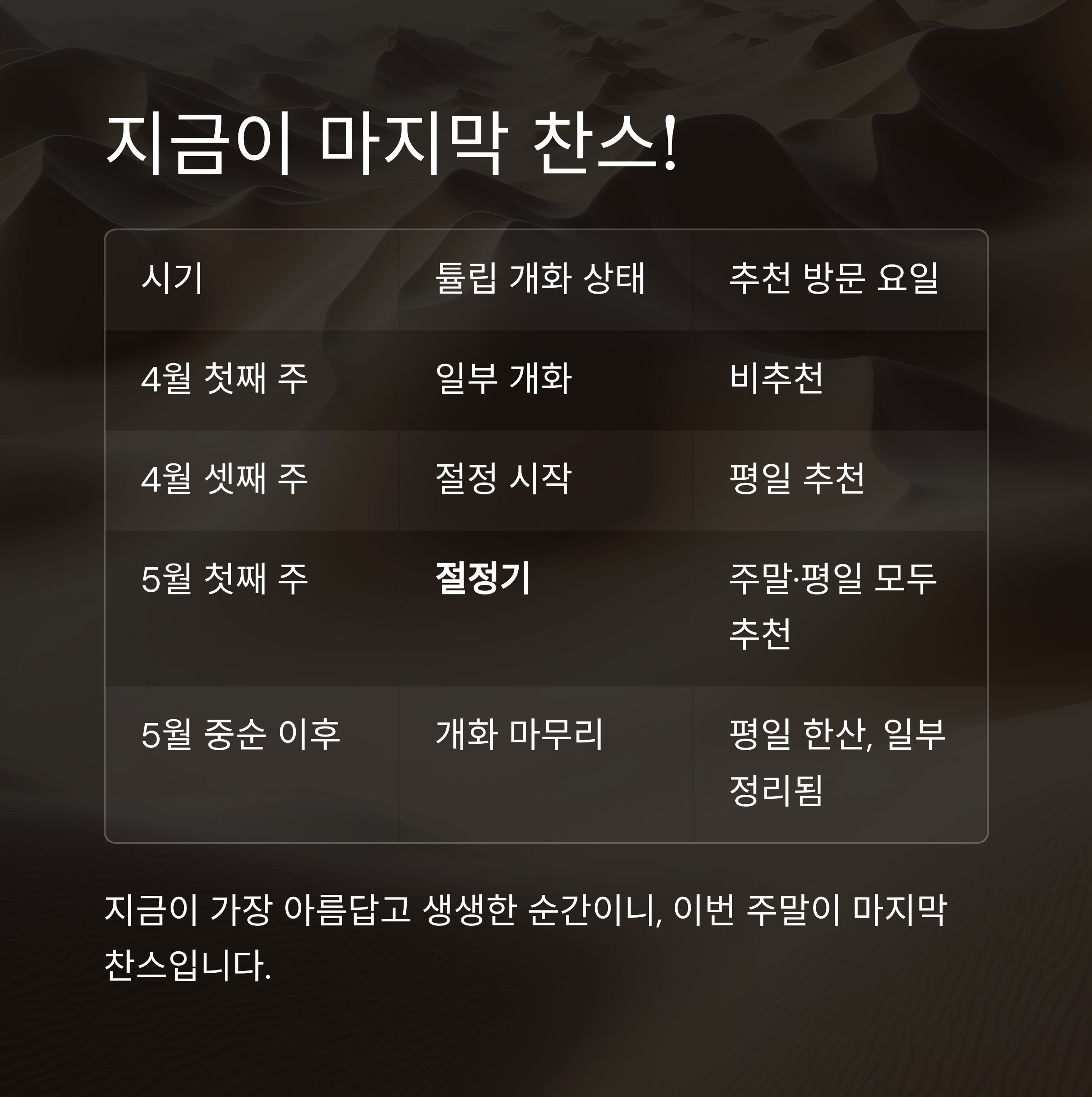 튤립의 계절인 지금, 전국 각지에서 수많은 방문객들이 찾는 이곳은 봄꽃 여행의 대표 명소로 떠올랐습니다.