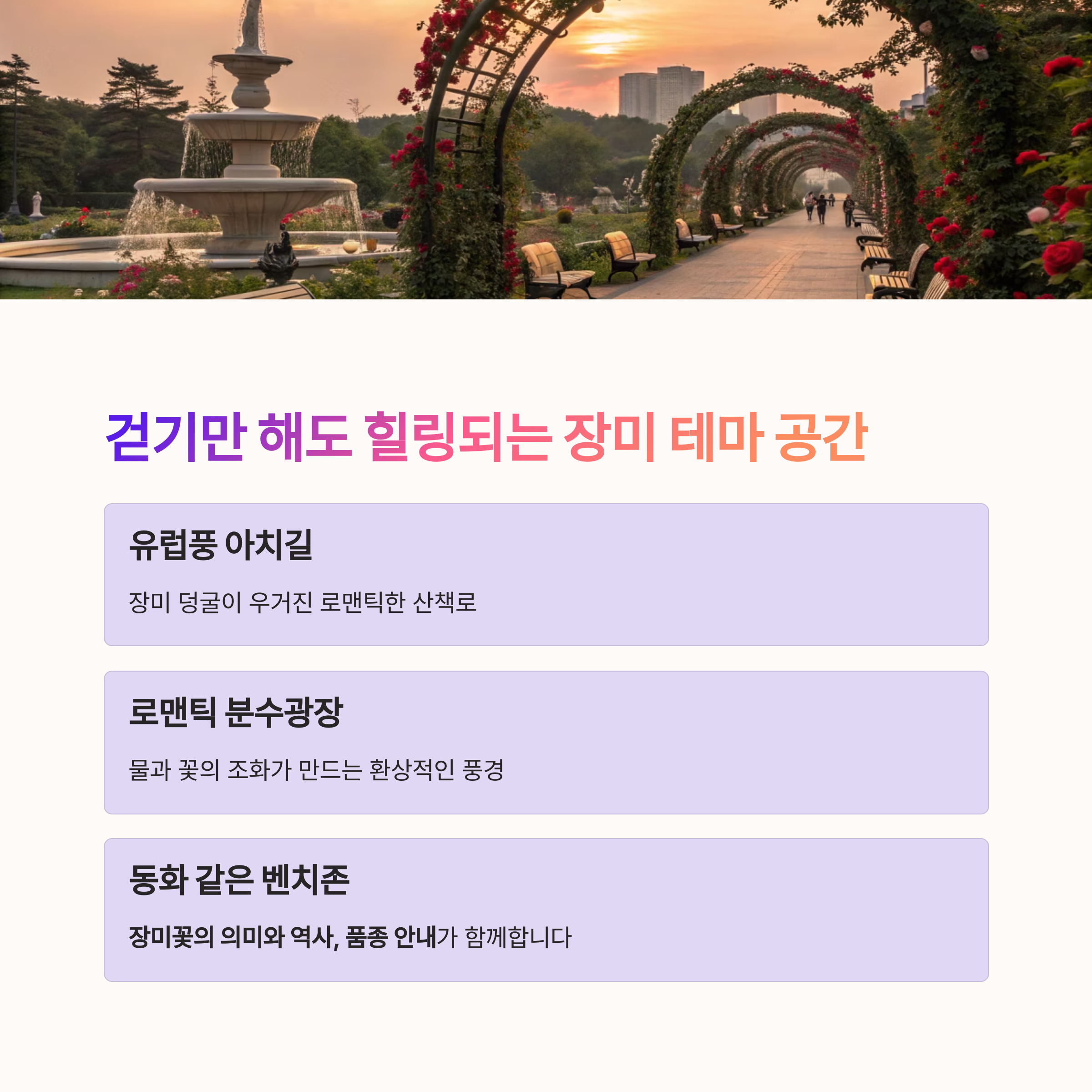 장미원은 단순한 정원이 아닌, 다양한 콘셉트로 구성된 공간입니다.