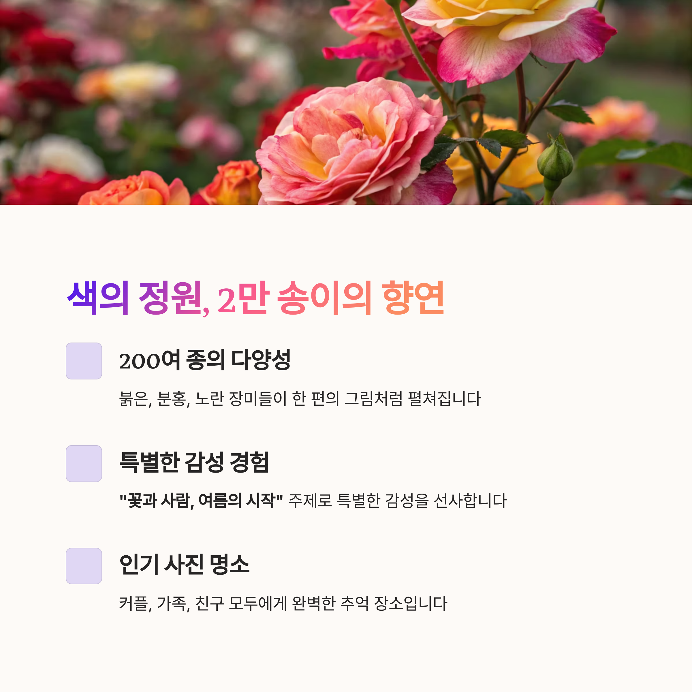 | 주요 포인트 | 200여 종 장미, 포토존, 장미차 체험, 버스킹 공연 |