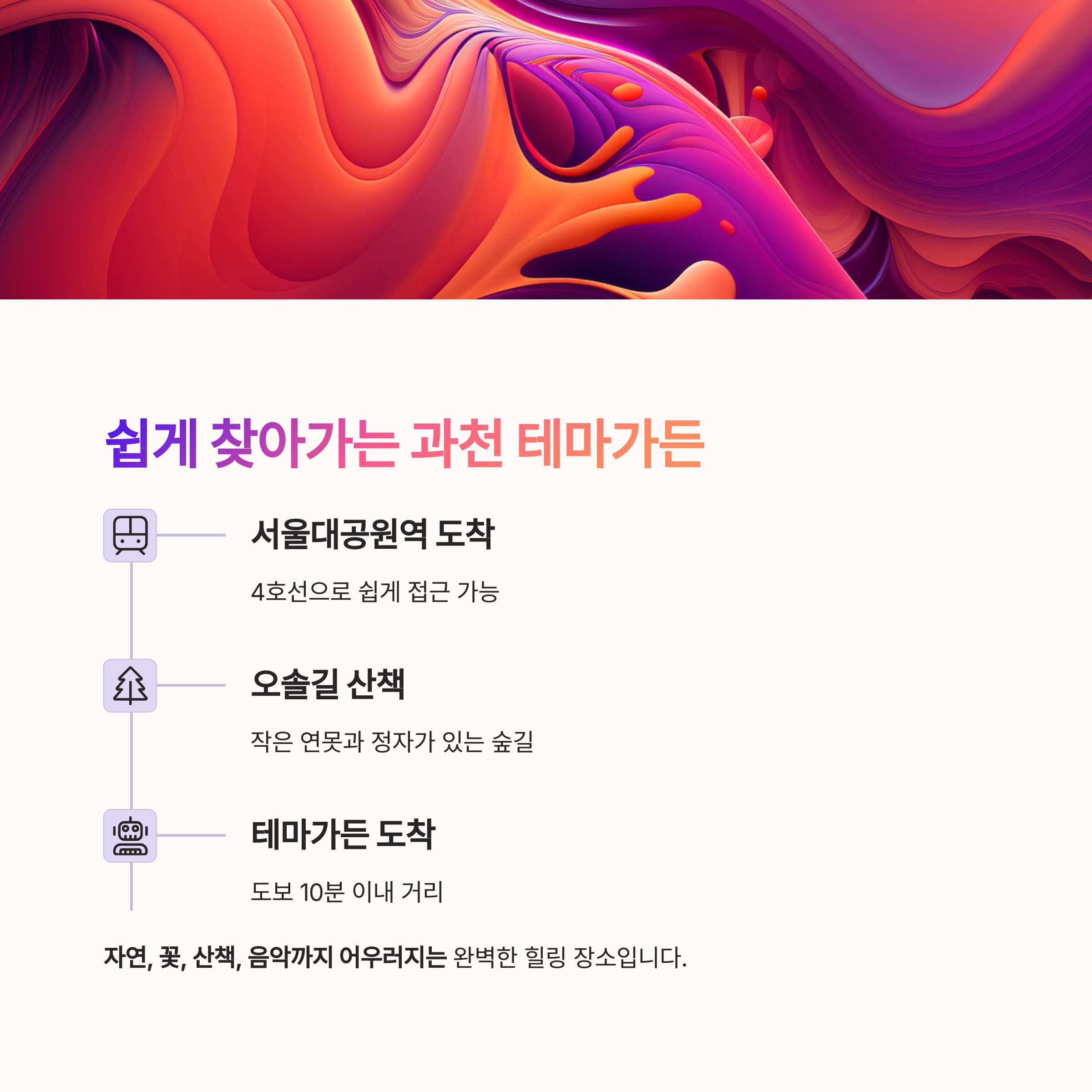 유럽풍 아치길, 로맨틱 분수광장, 동화 같은 벤치존 등 걷는 내내 색다른 매력을 느낄 수 있습니다.